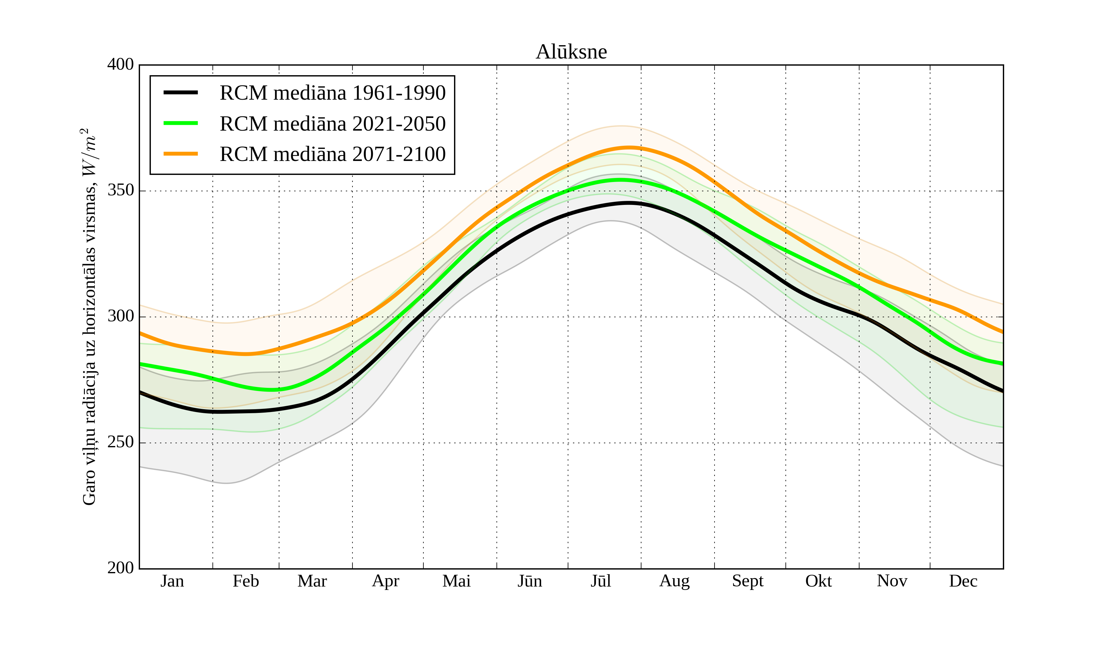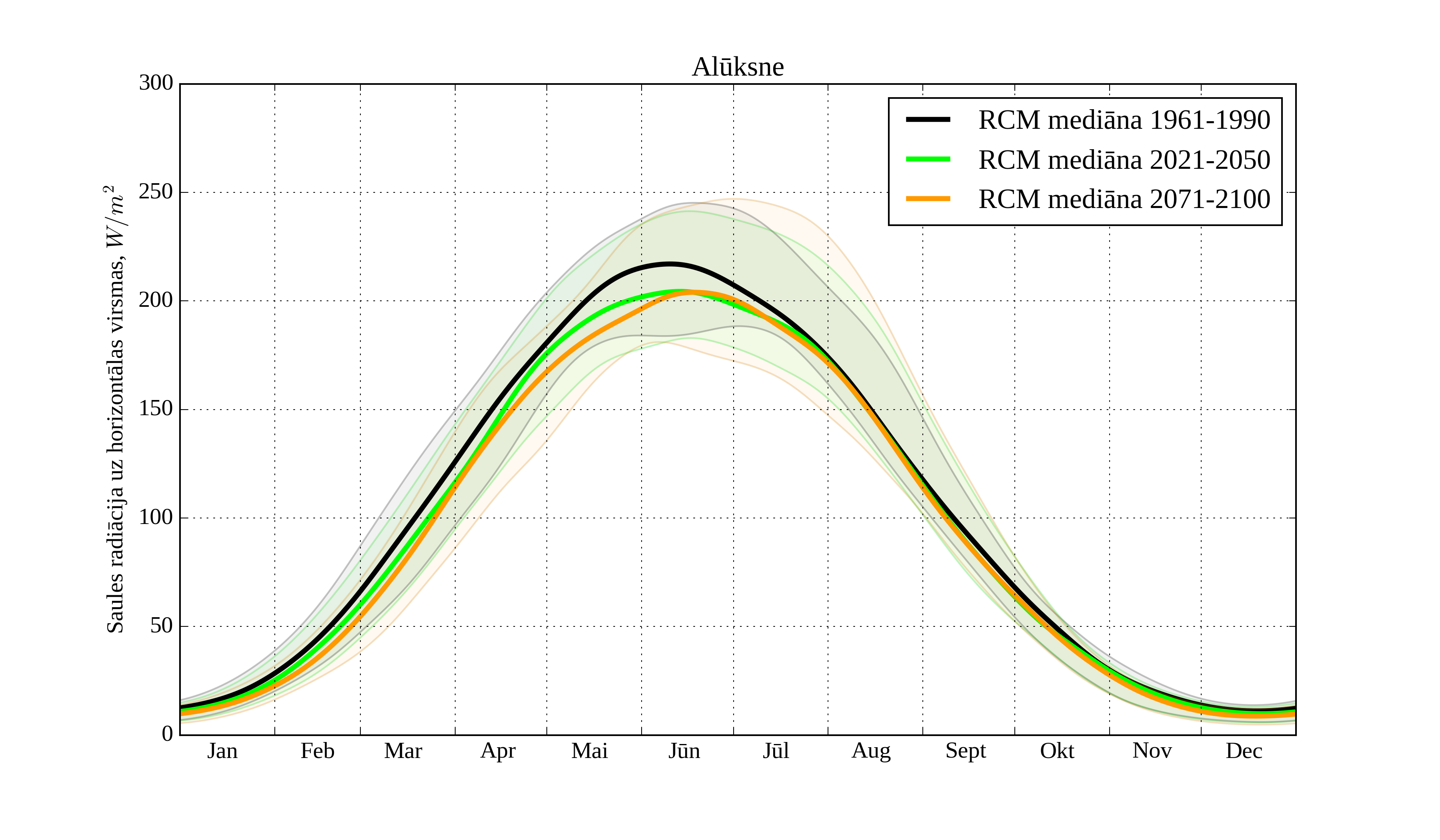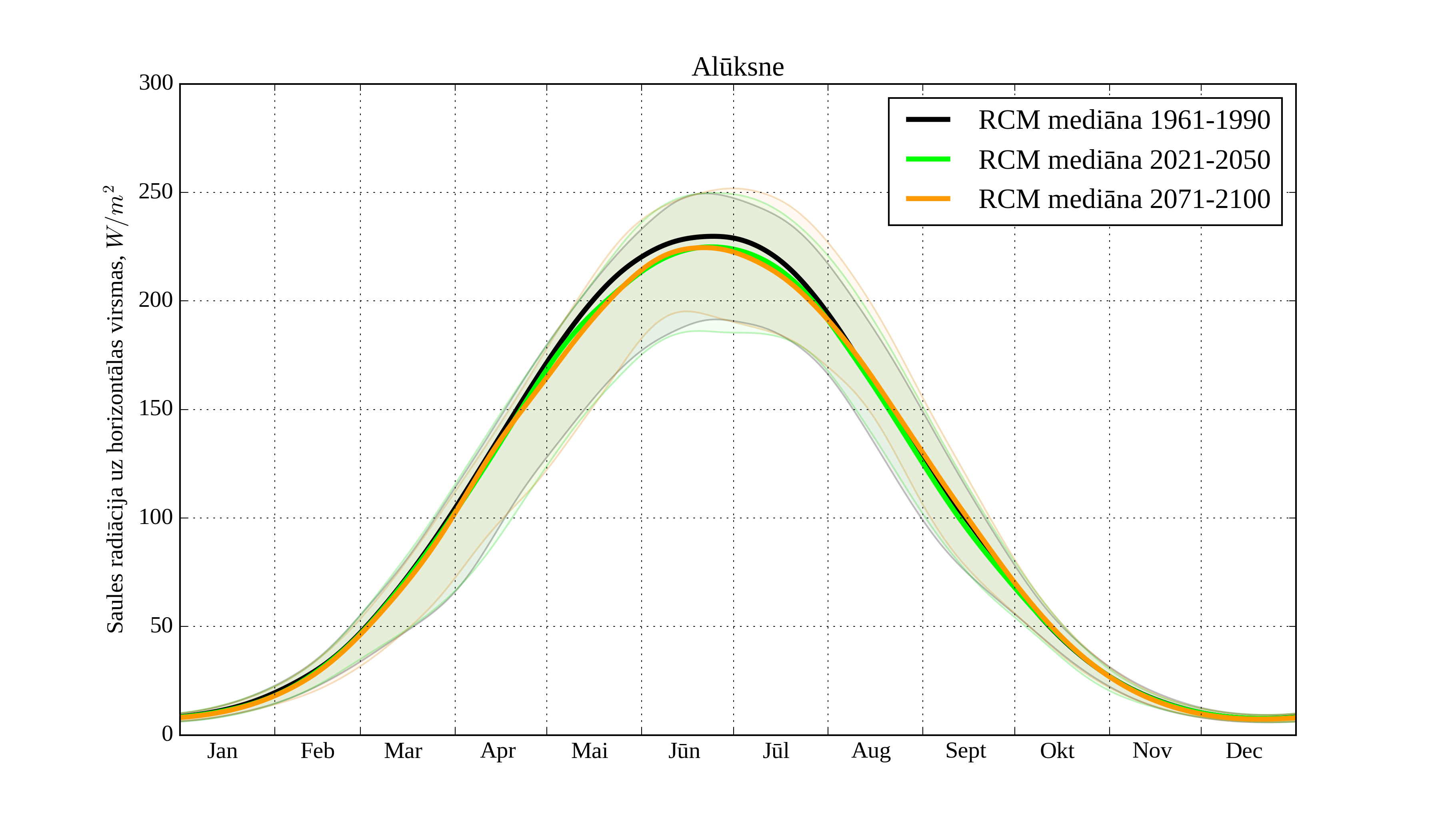 Figure 24. Monthly solar irradiation on horizontal surface for different climatological periods in Aluksne with derived RCM irradiation