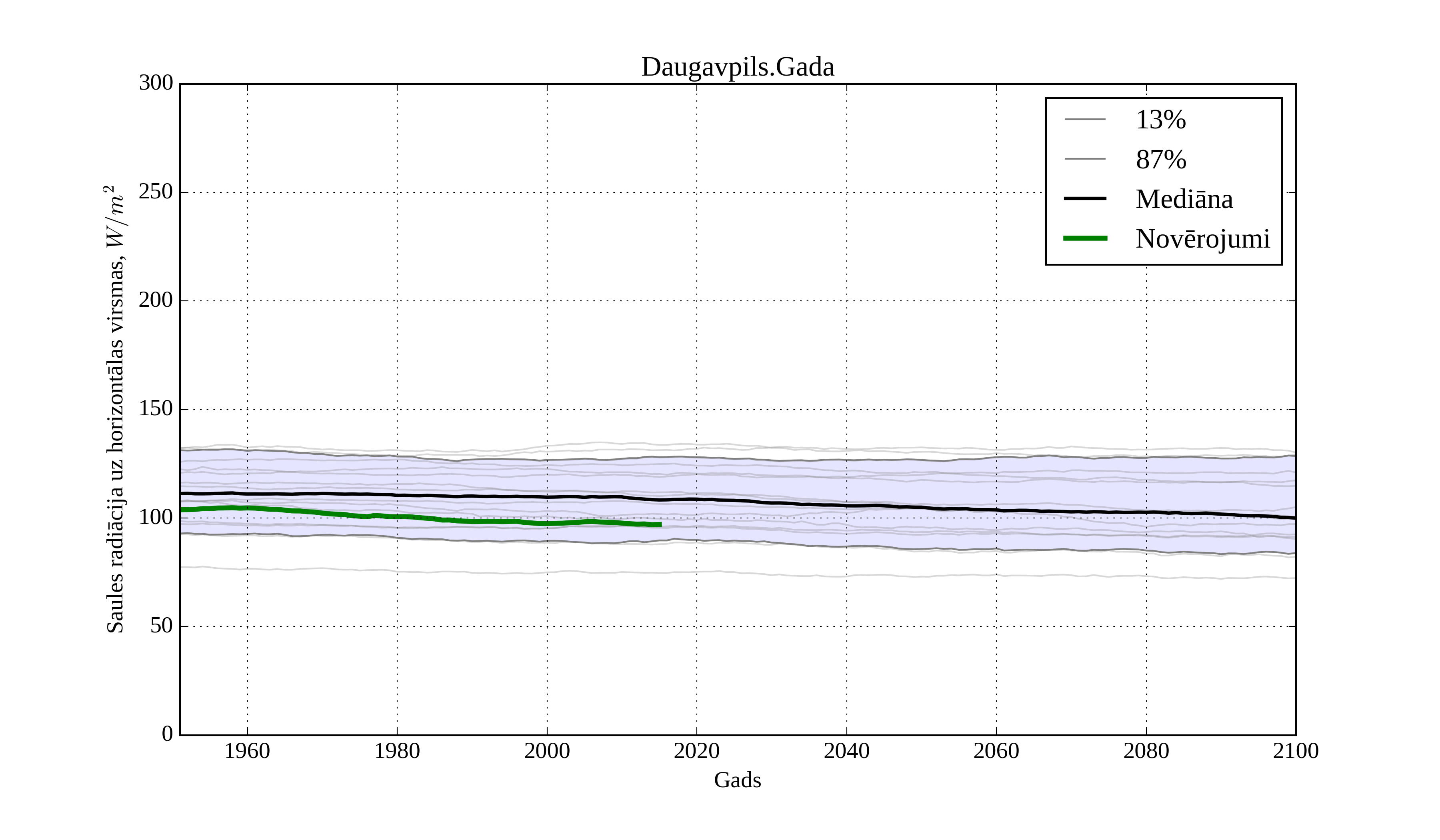 Figure 20. Climatological trend of yearly average solar irradiation on horizontal surface in Aluksne with derived RCM irradiation