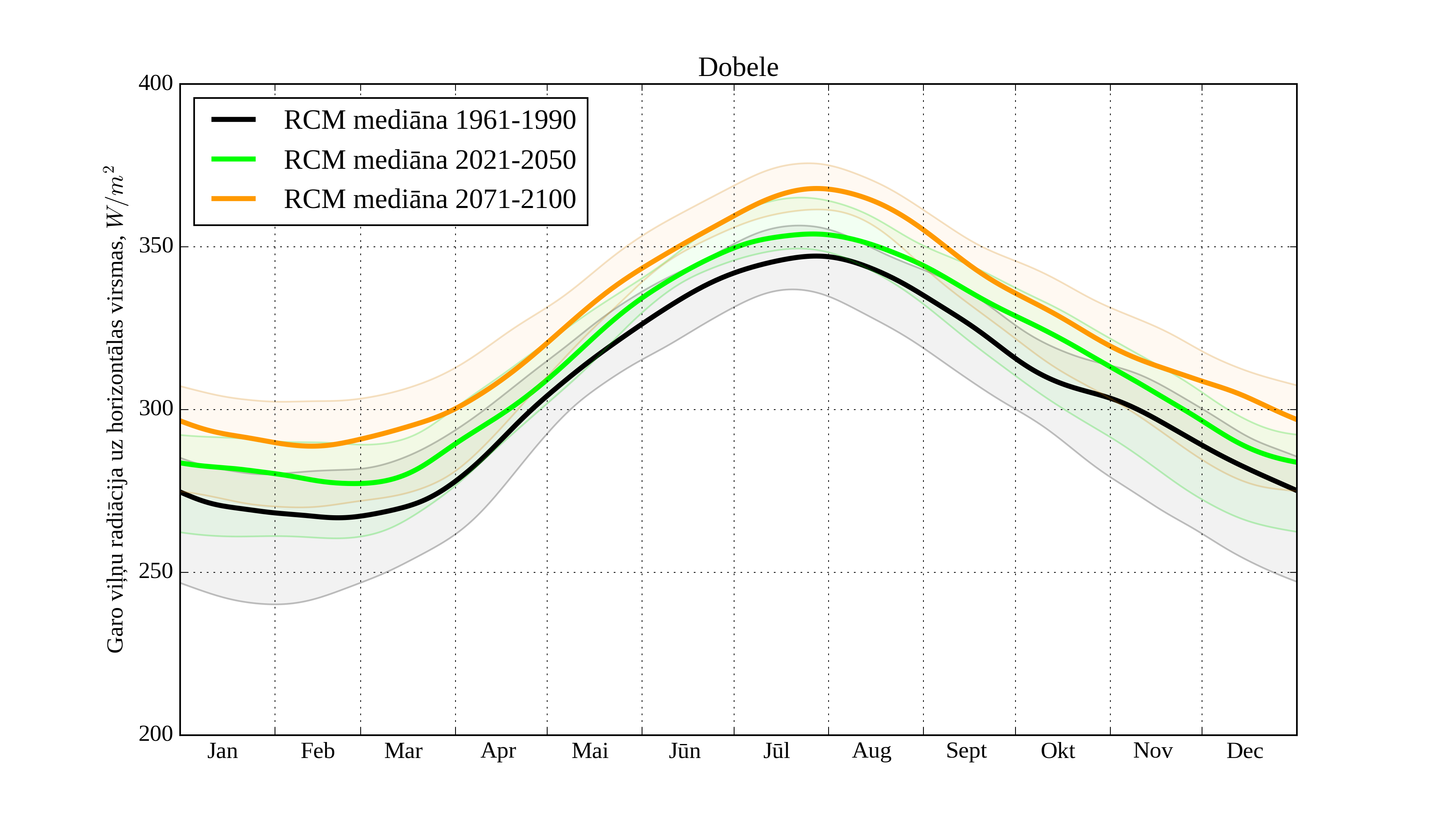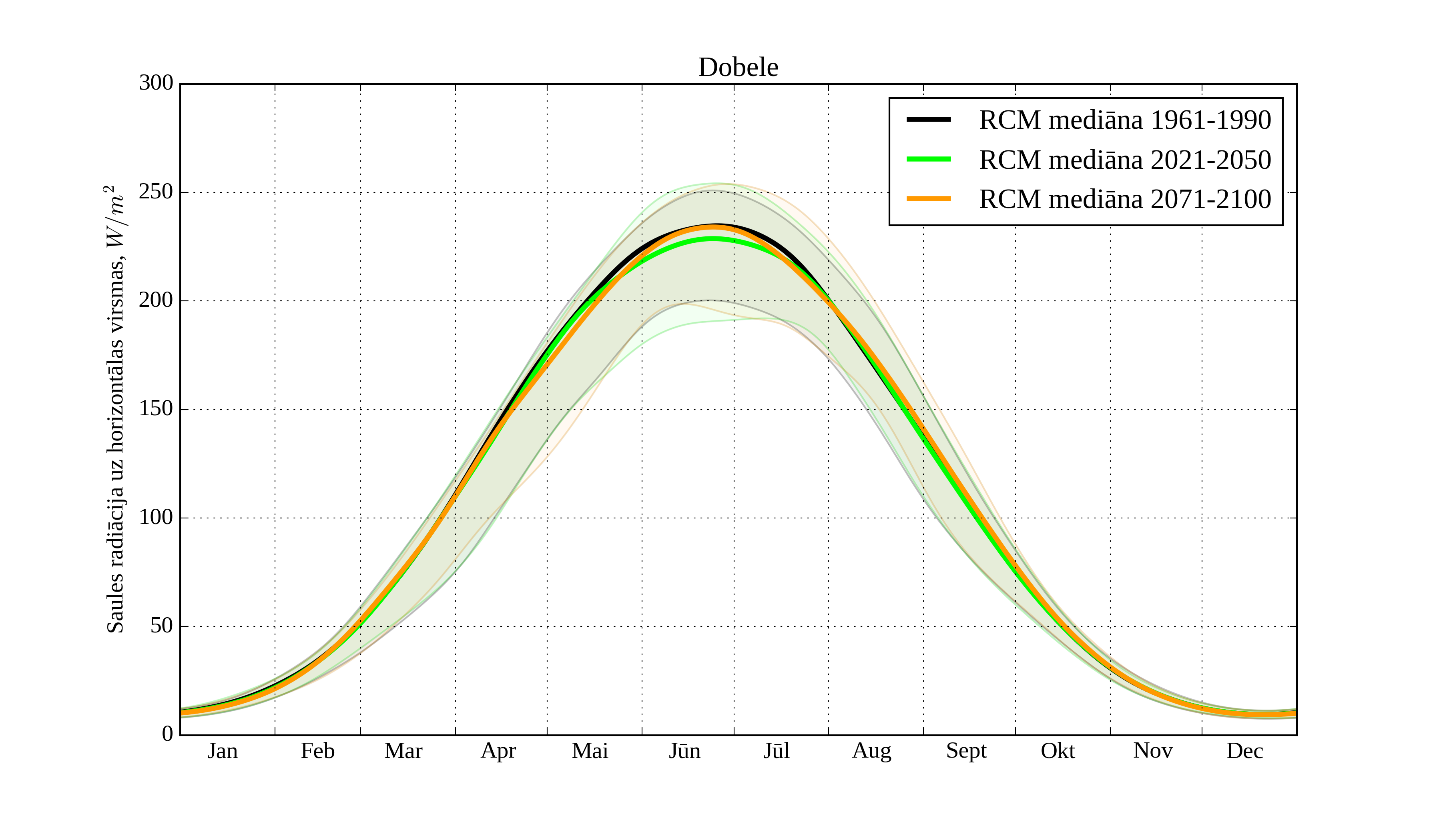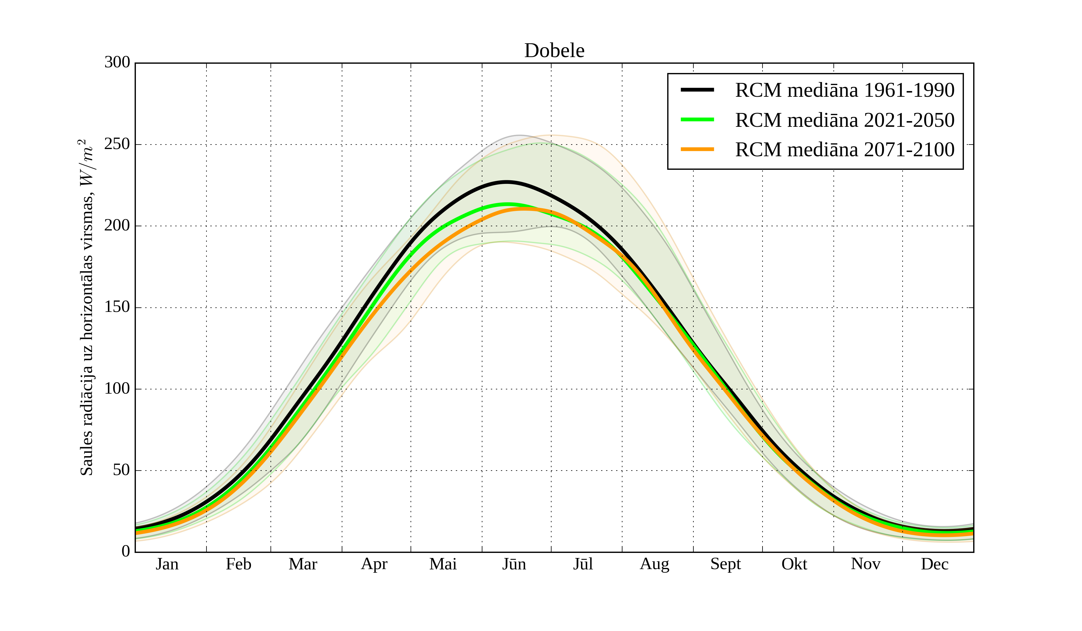 Figure 25. Monthly solar irradiation on horizontal surface for different climatological periods in Dobele with derived RCM irradiation