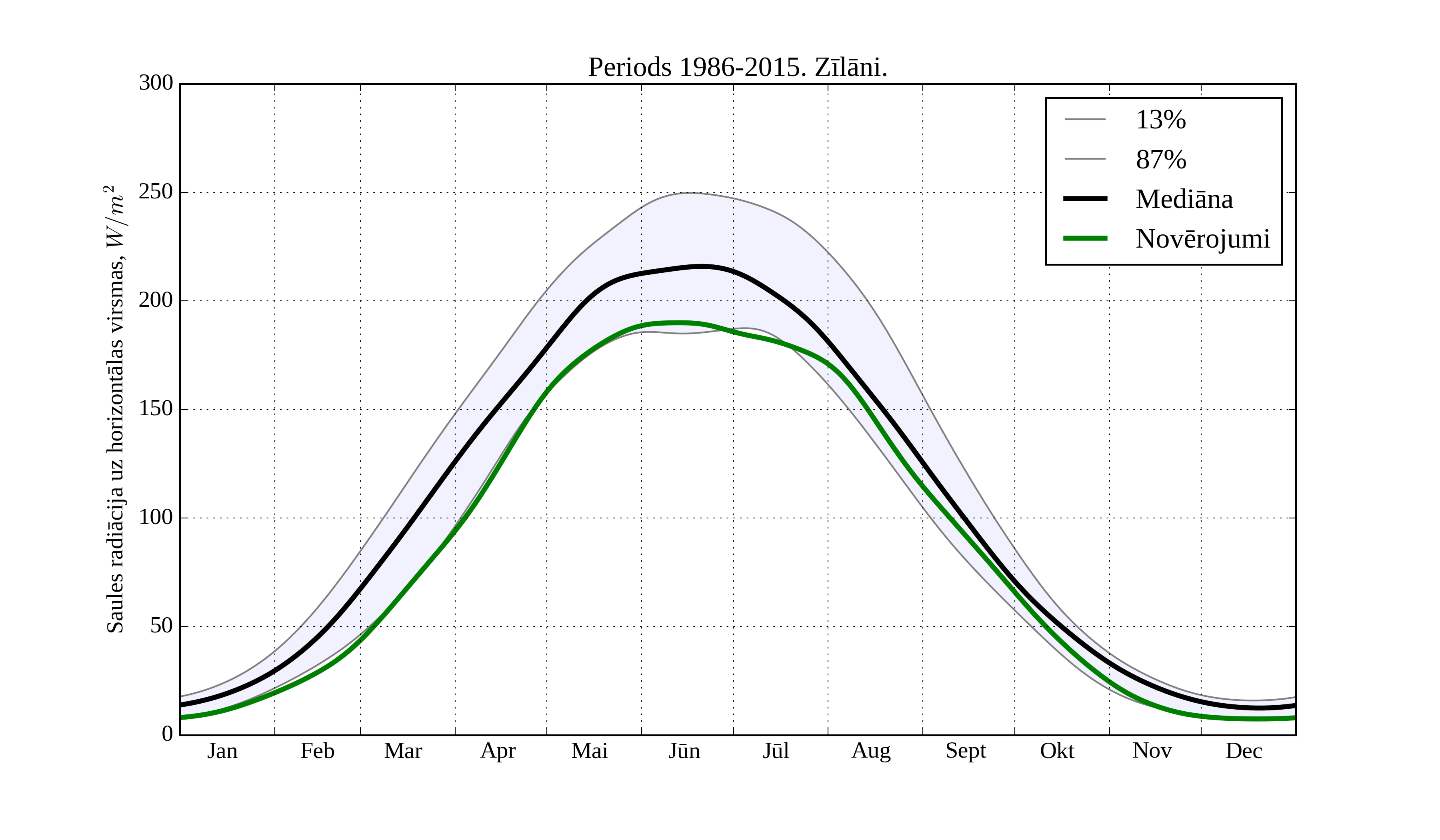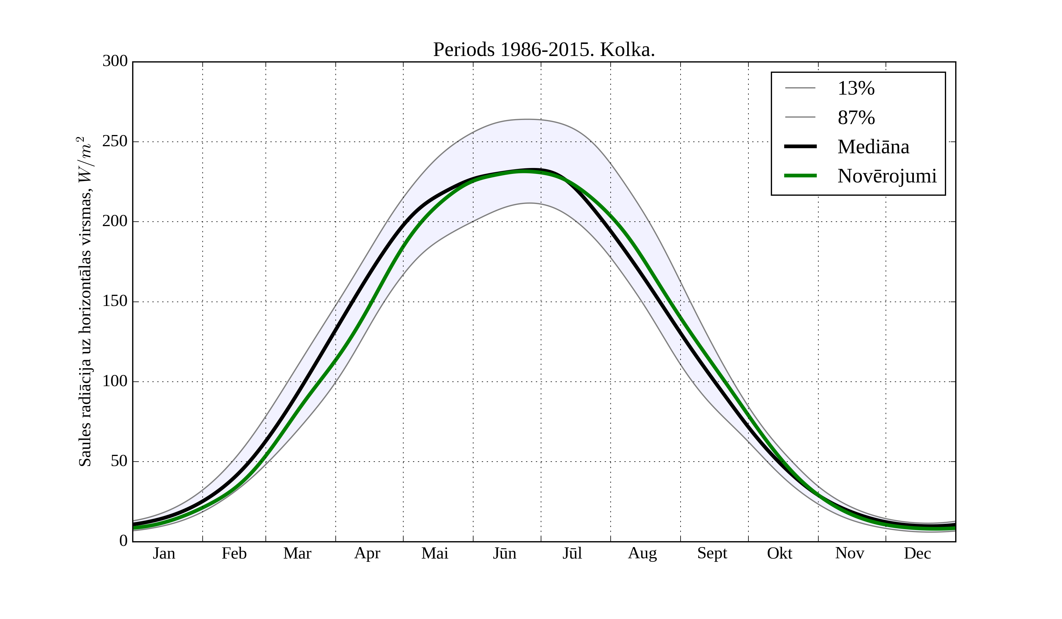 Figure 13. Monthly solar irradiation on horizontal surface for different climatological periods in Dobele