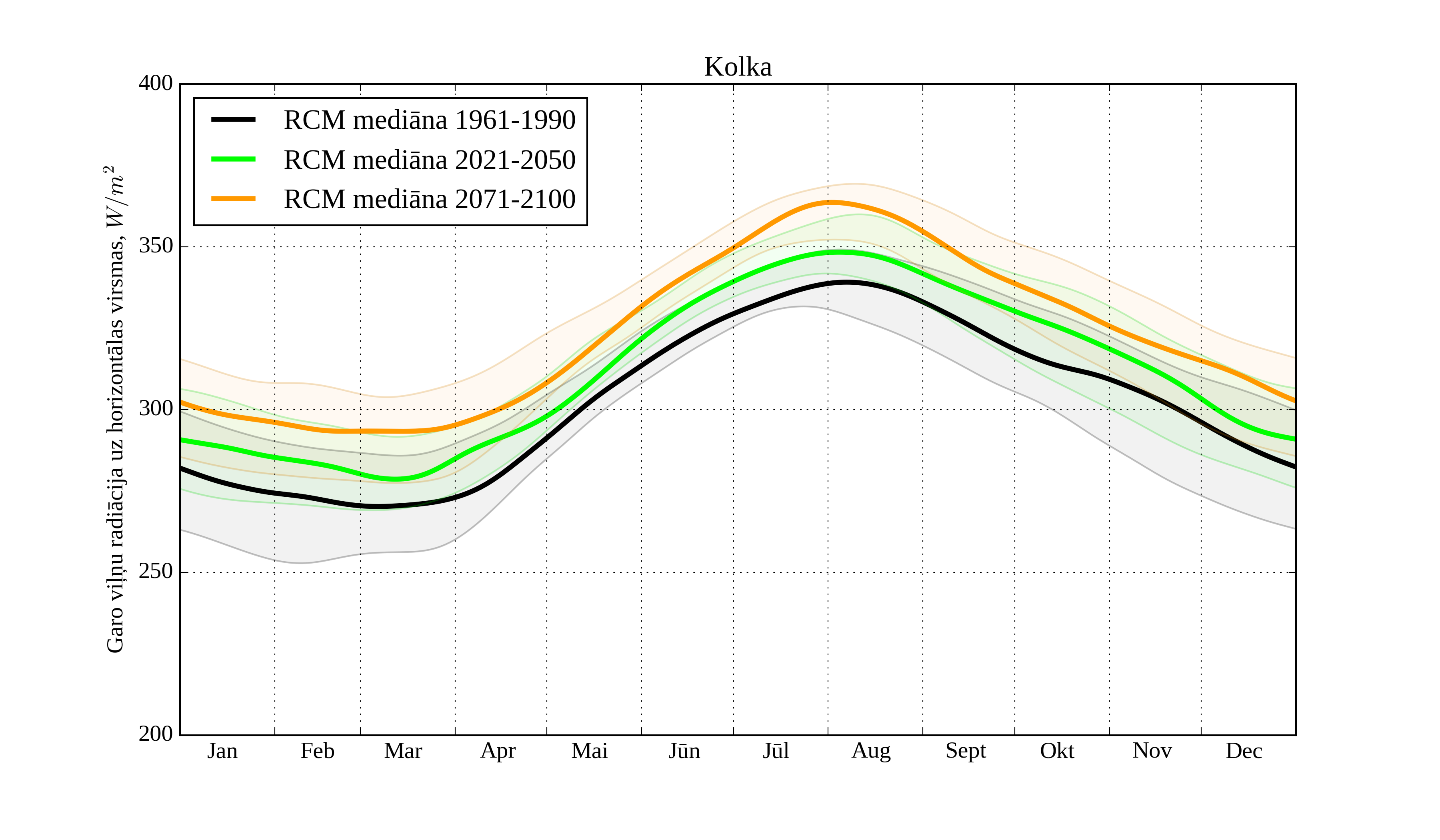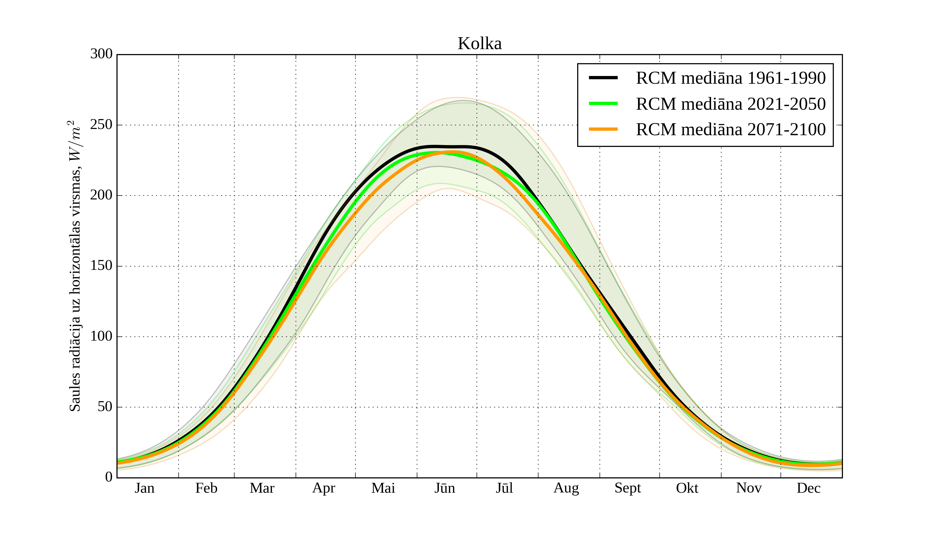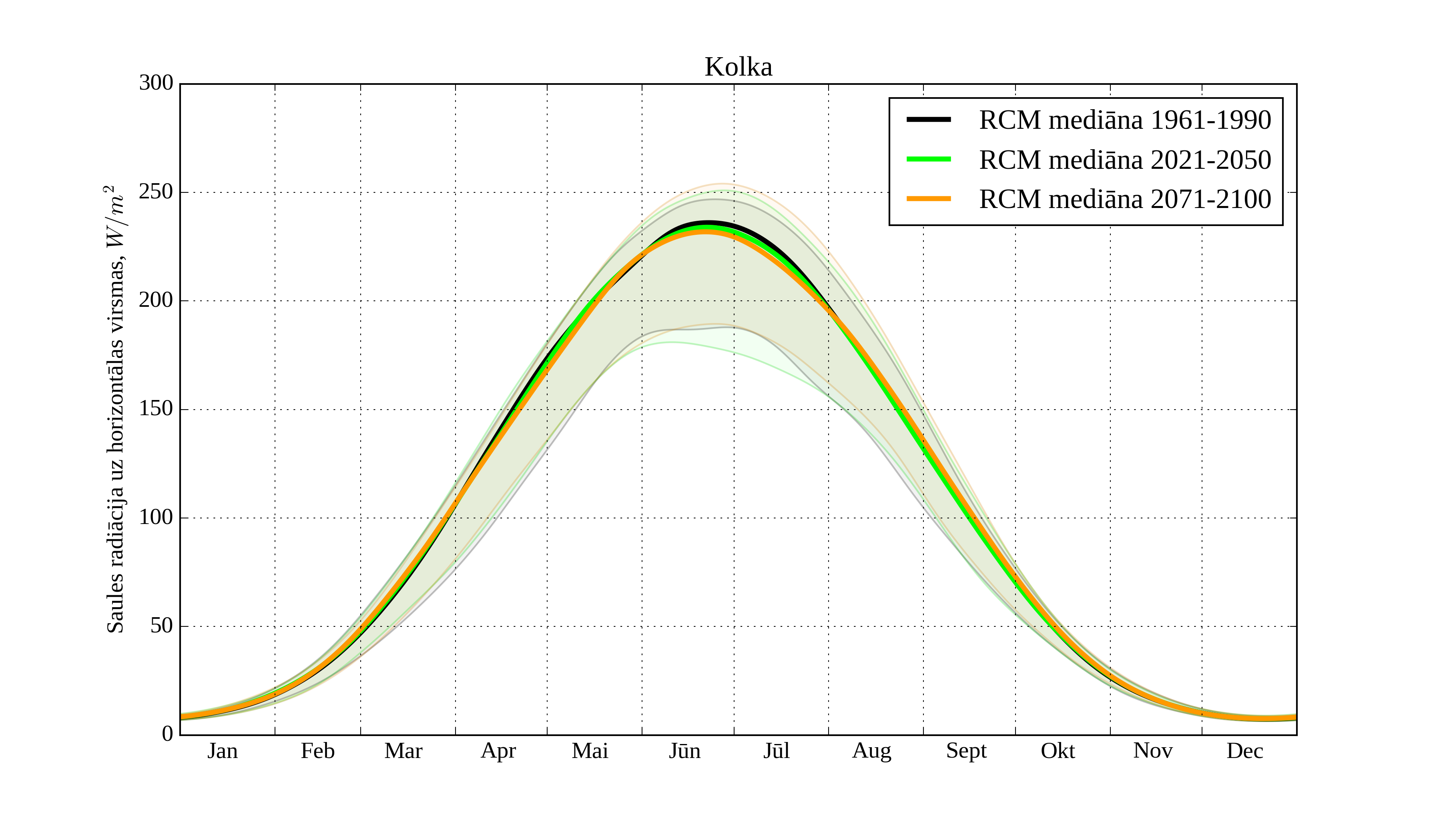 Figure 23. Monthly solar irradiation on horizontal surface for different climatological periods in Kolka with derived RCM irradiation
