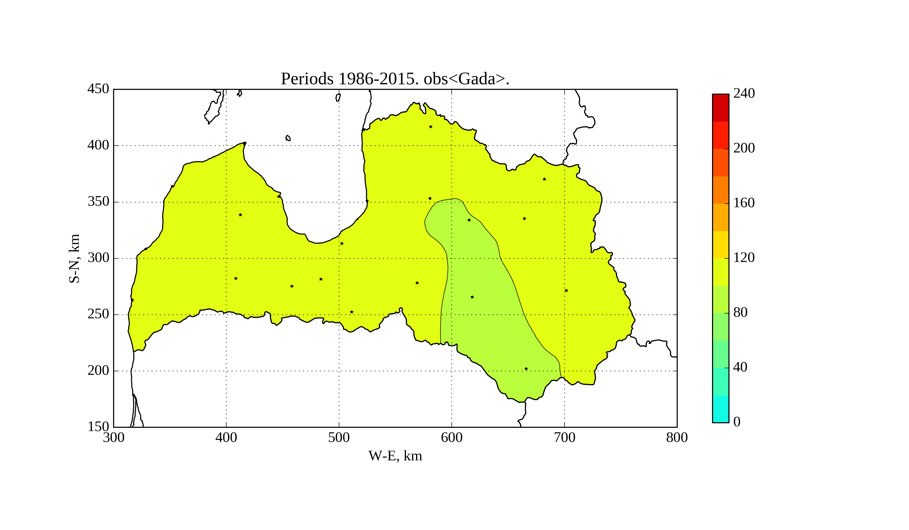 Yearly average downward surface radiation maps in period 1986-2015 are shown in Figures 3-4 (RCM and derived obserbvations).