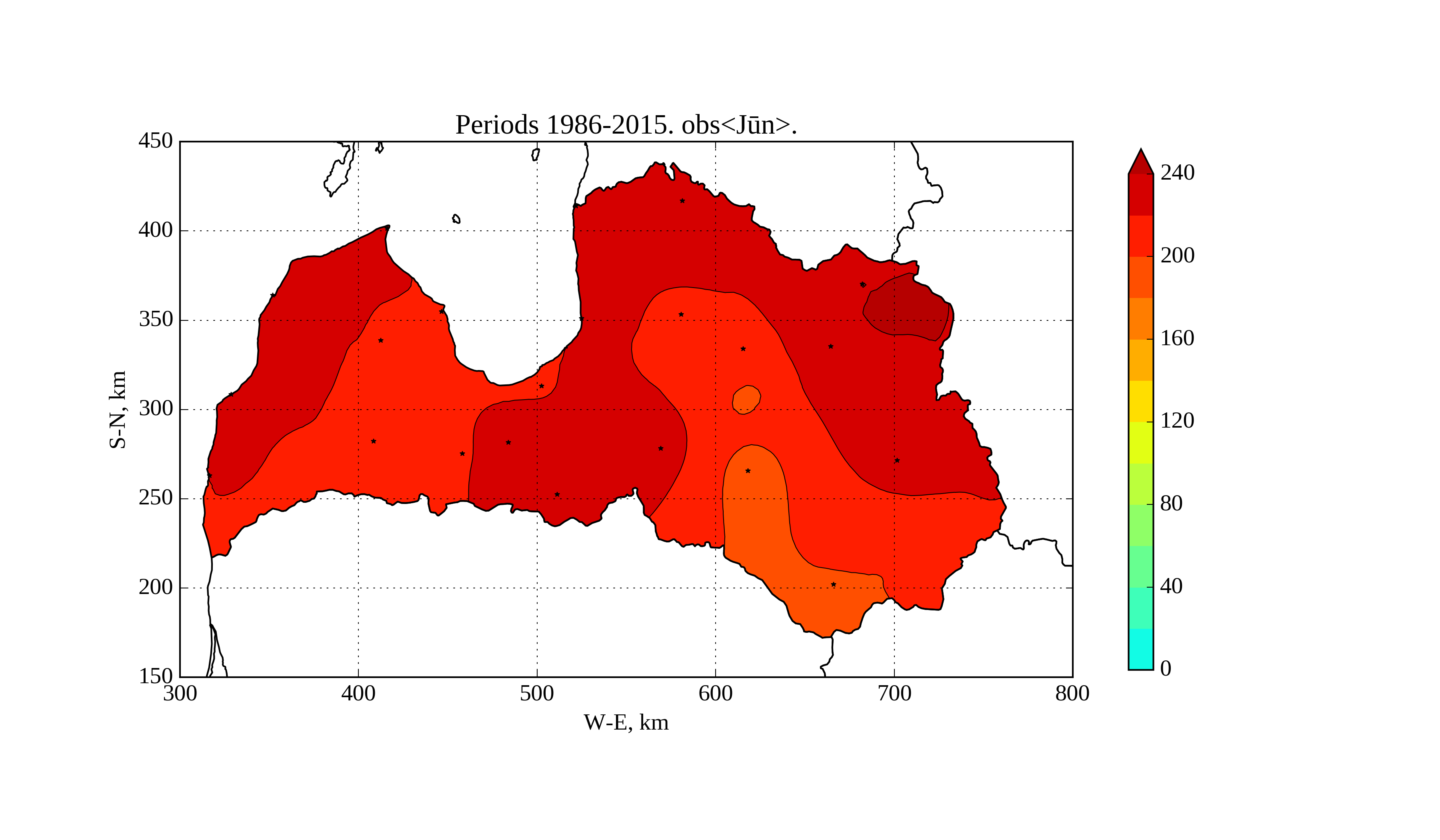 Figure 6. Average solar irradiation [W/m^2] on horizontal surface in June 1986-2015 according to derived observations