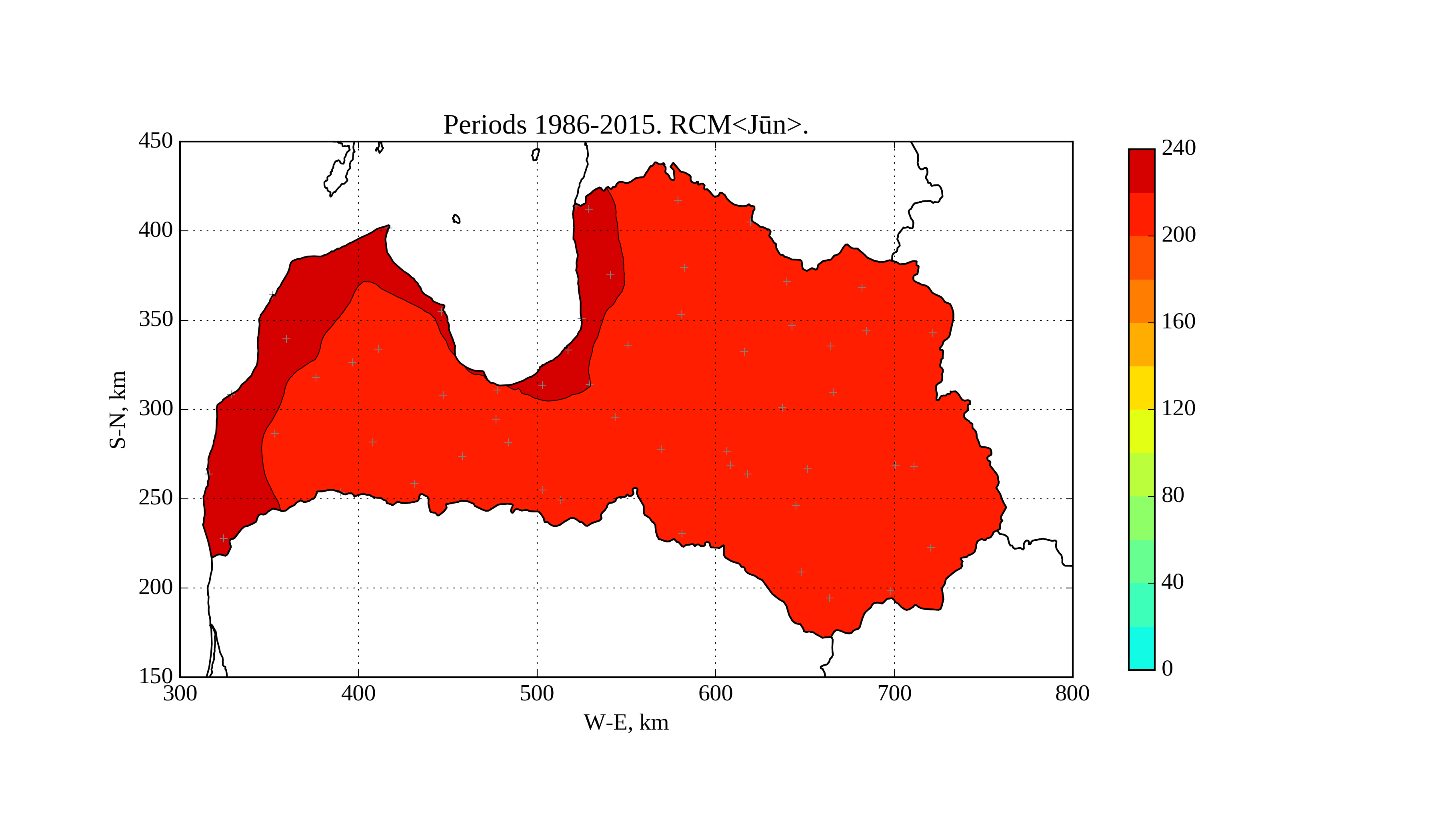 Figure 5. Average solar irradiation [W/m^2] on horizontal surface in June 1986-2015 according to RCM