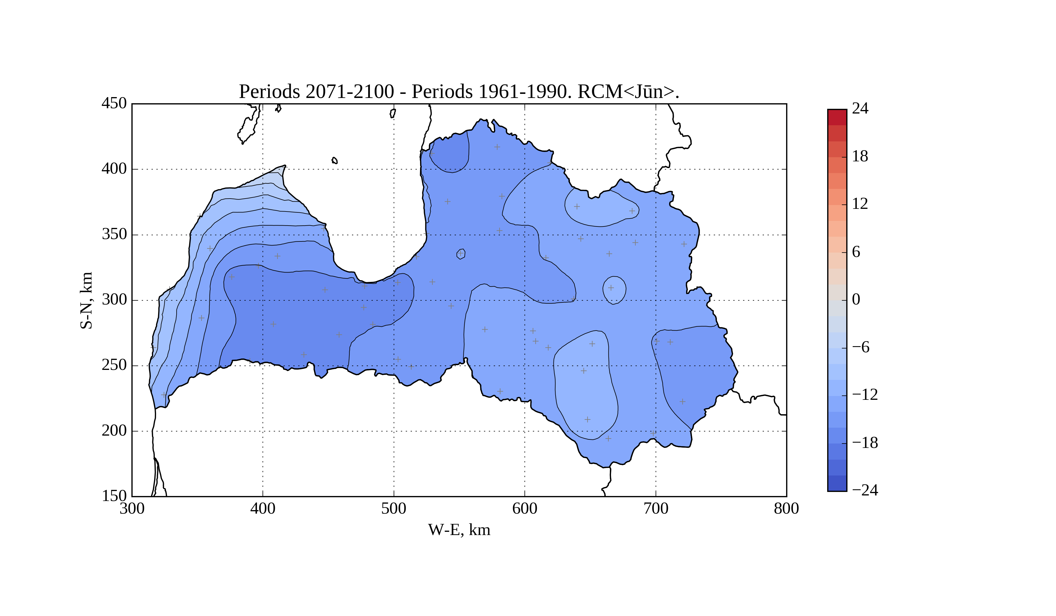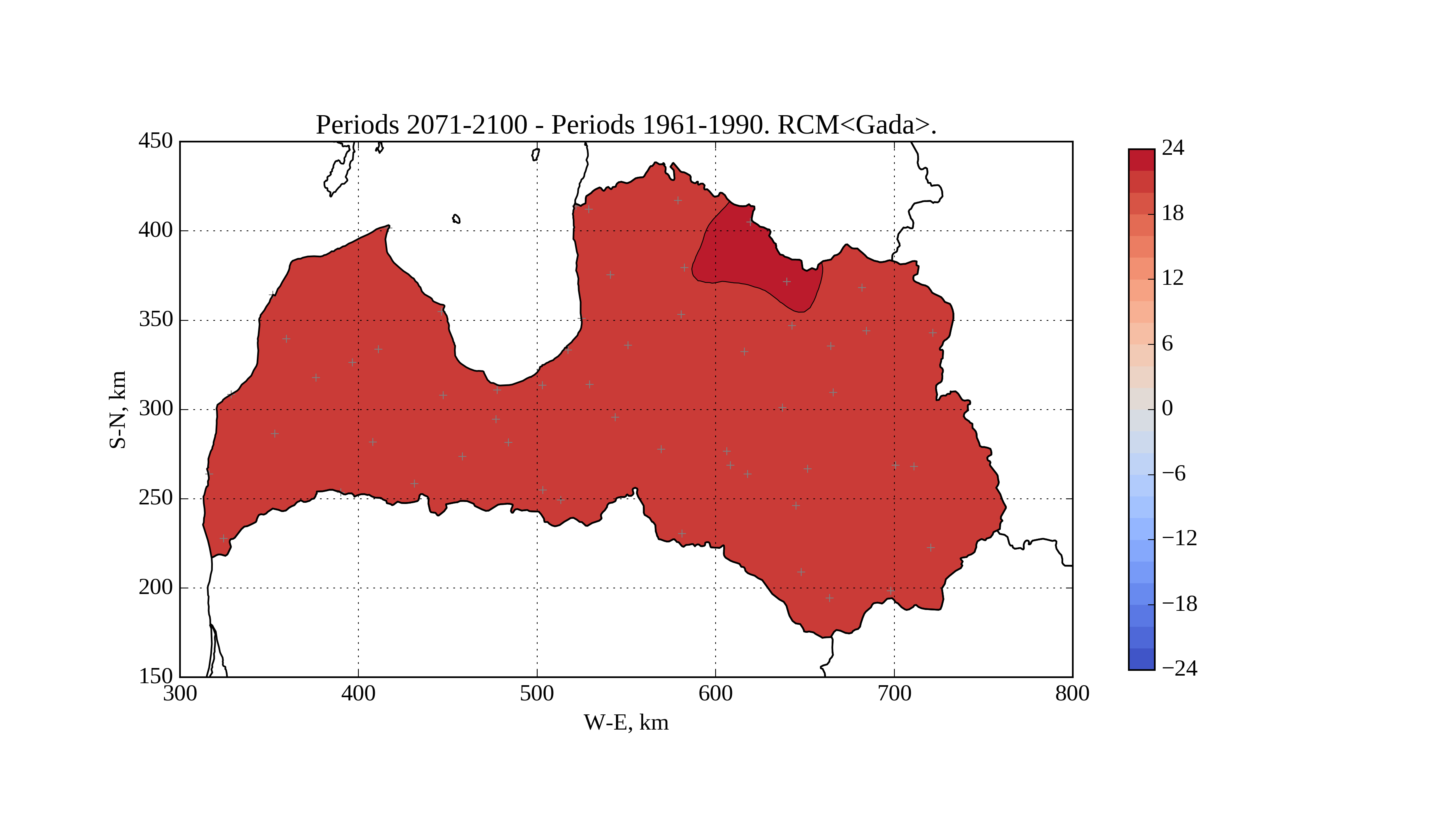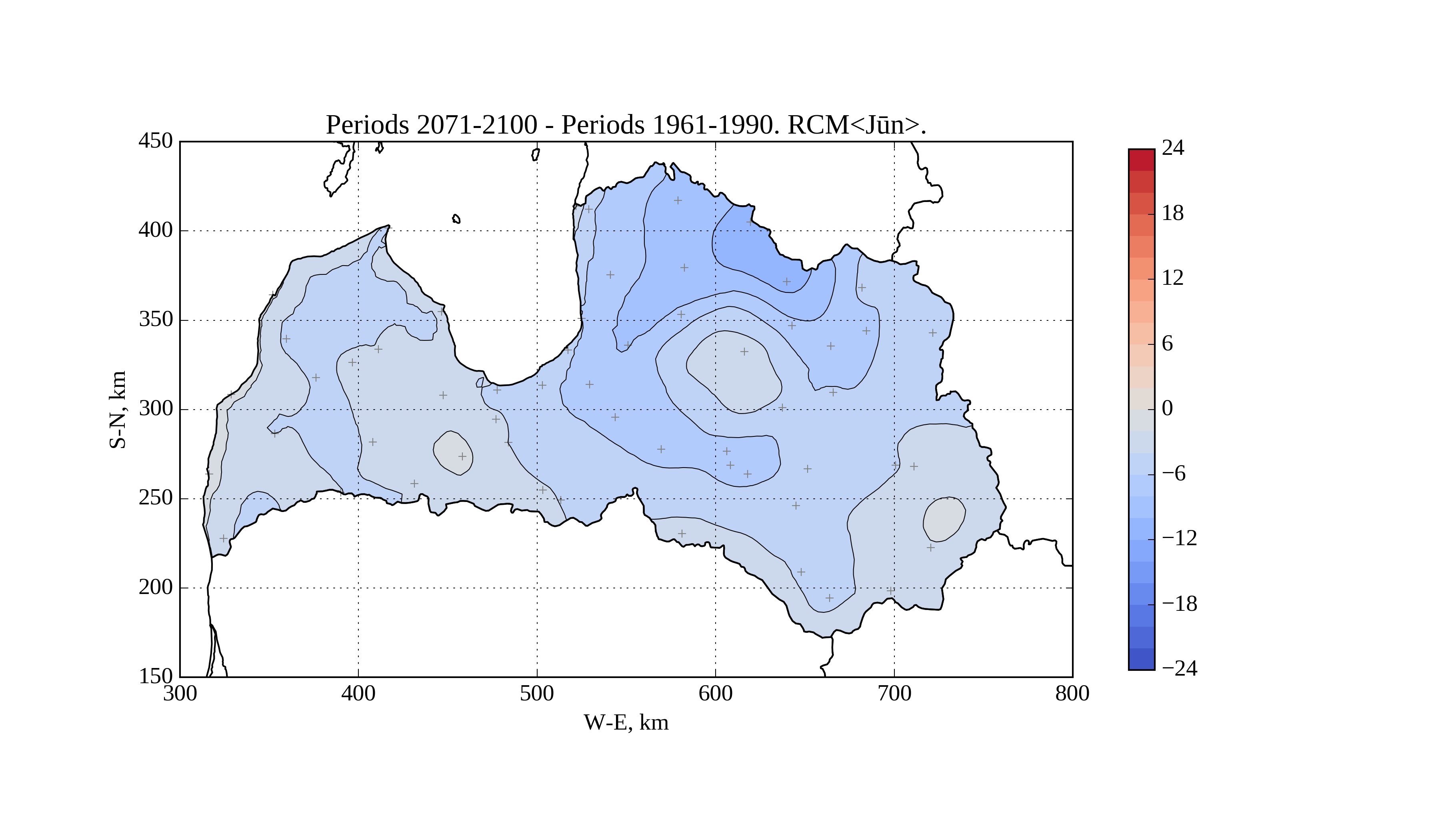 Figure 17. Change of average solar irradiation [W/m^2] on horizontal surface in June from period 1961-1990 to 2071-2100