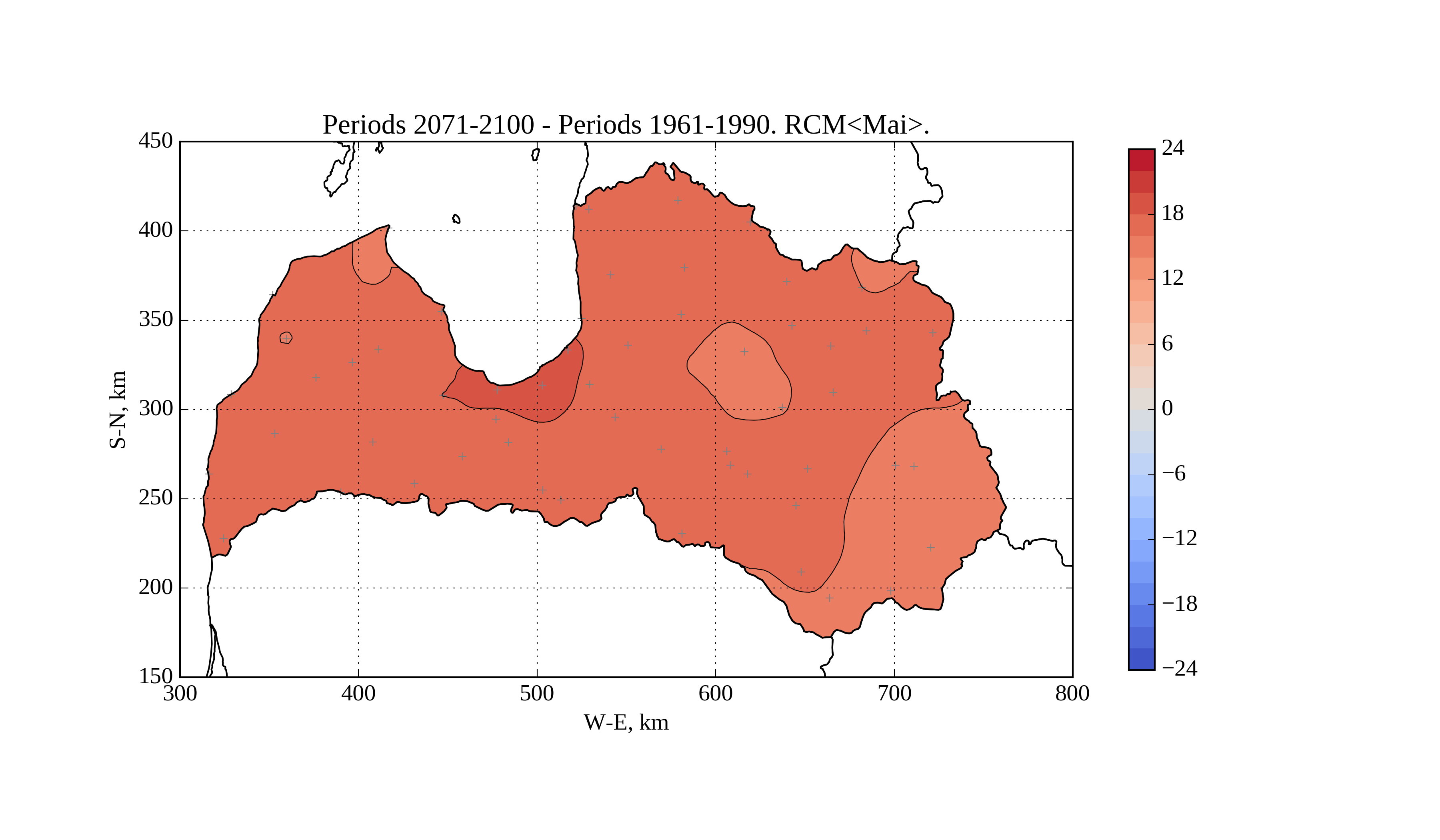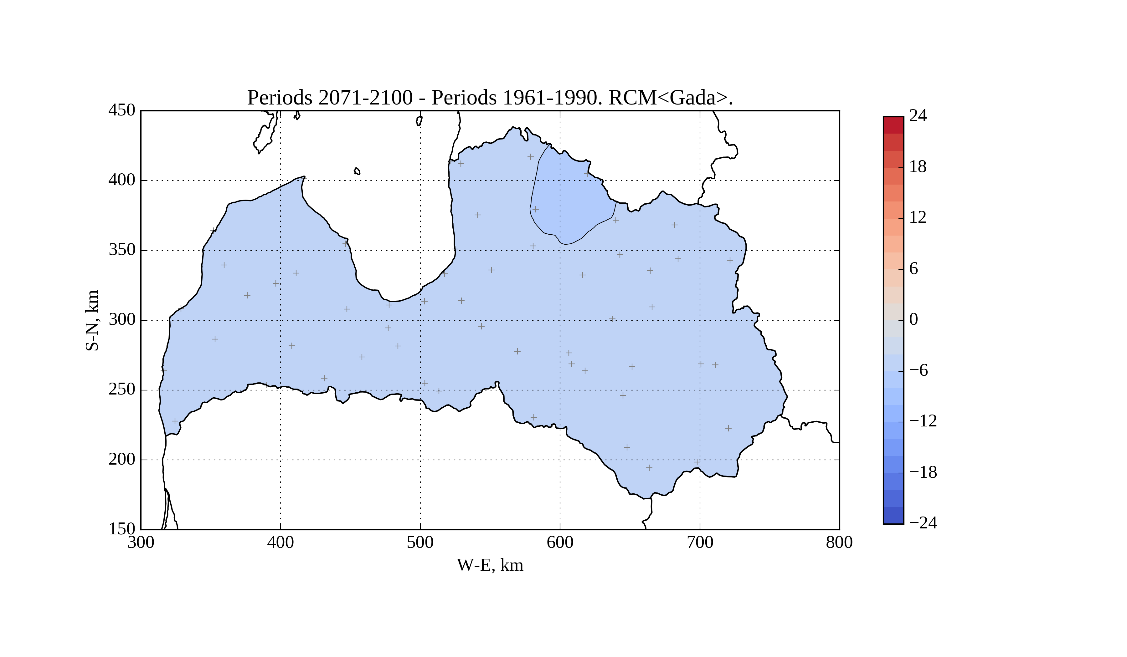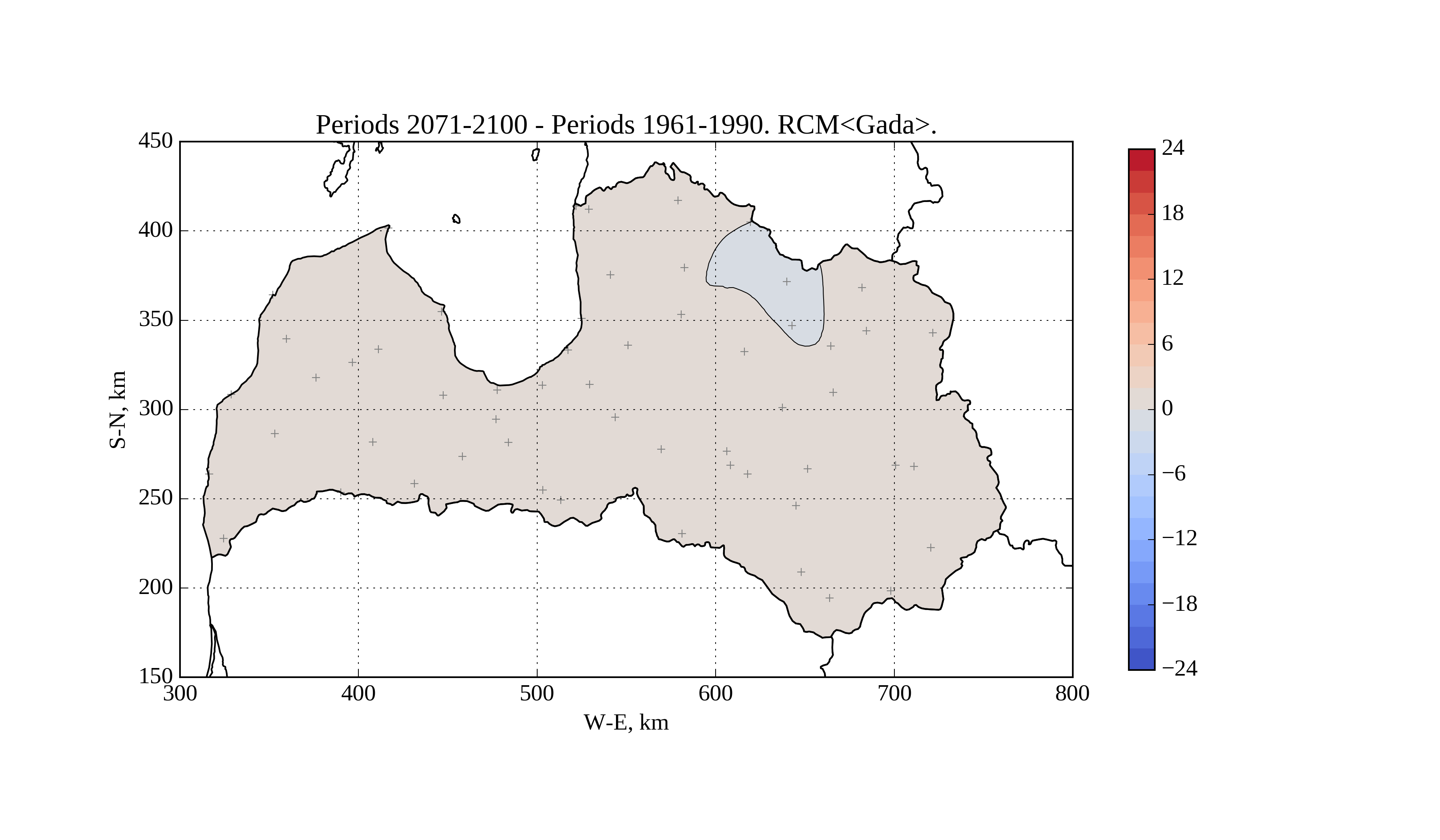 Figure 17. Change of average solar irradiation [W/m^2] on horizontal surface in June from period 1961-1990 to 2071-2100