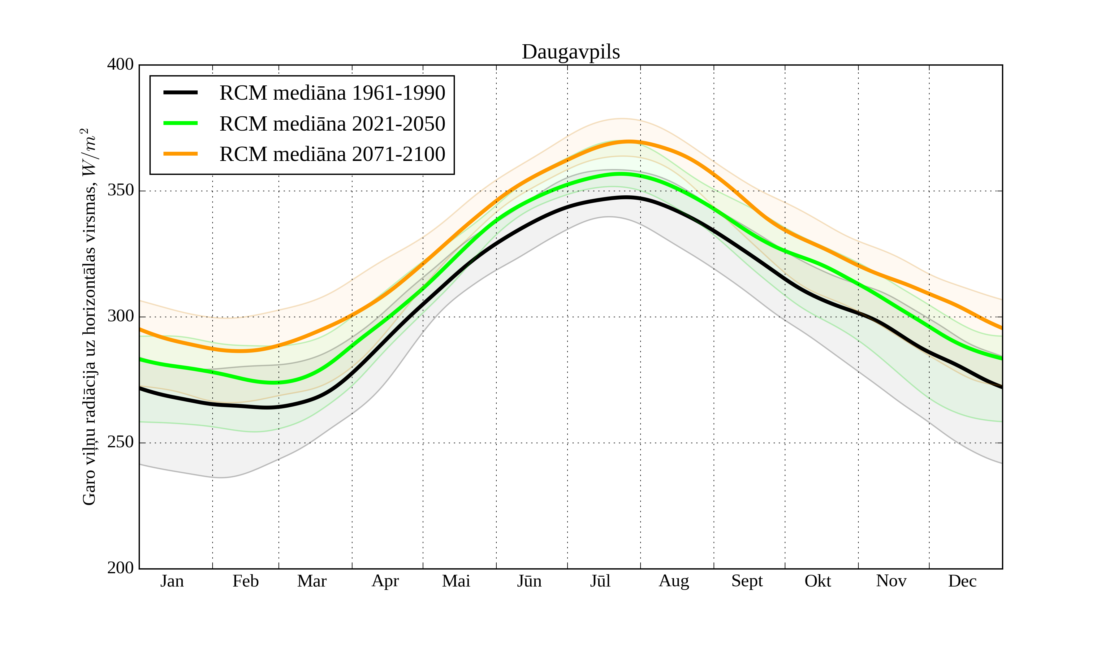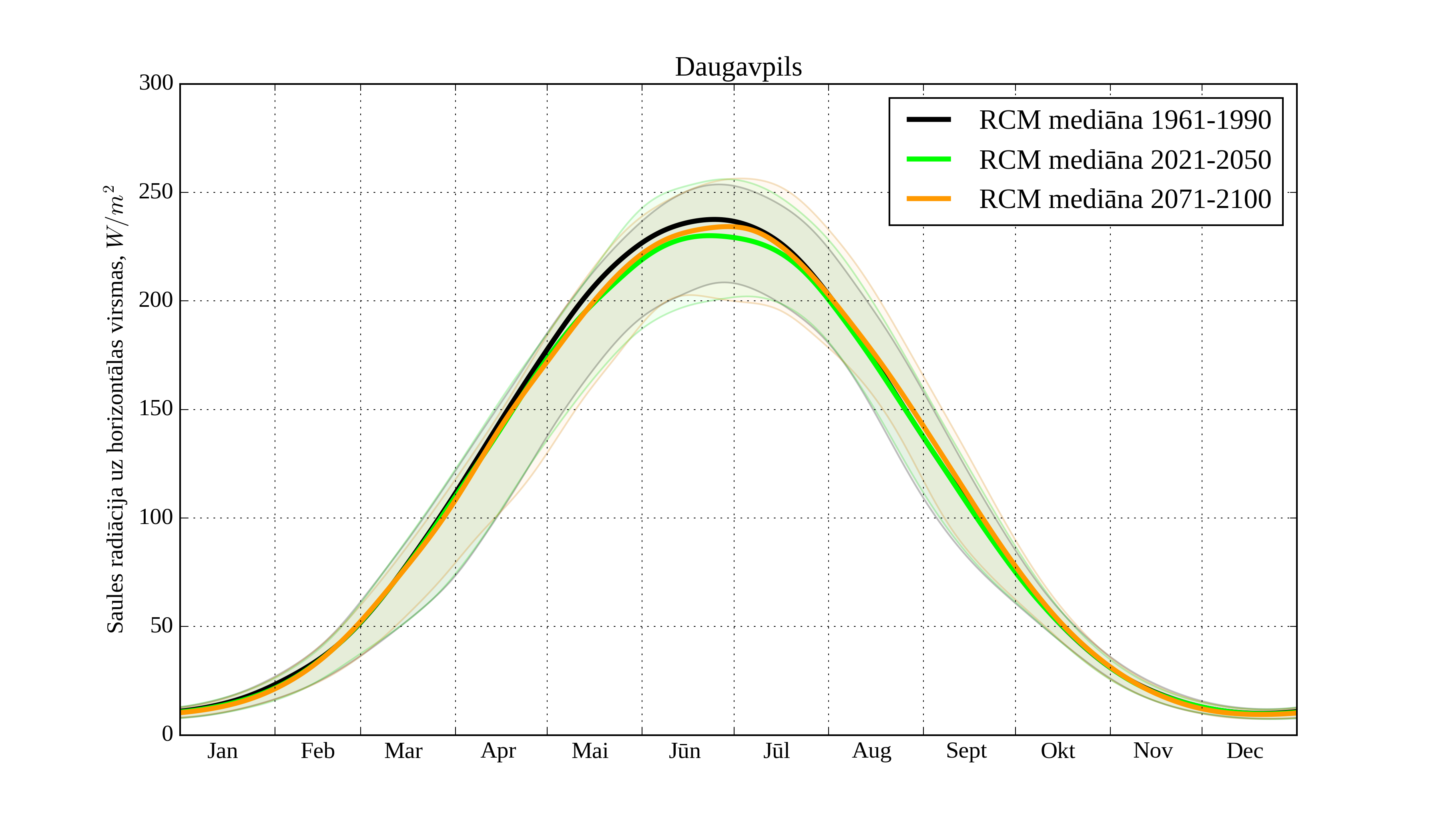 Figure 26. Monthly solar irradiation on horizontal surface for different climatological periods in Daugavpils with derived RCM irradiation