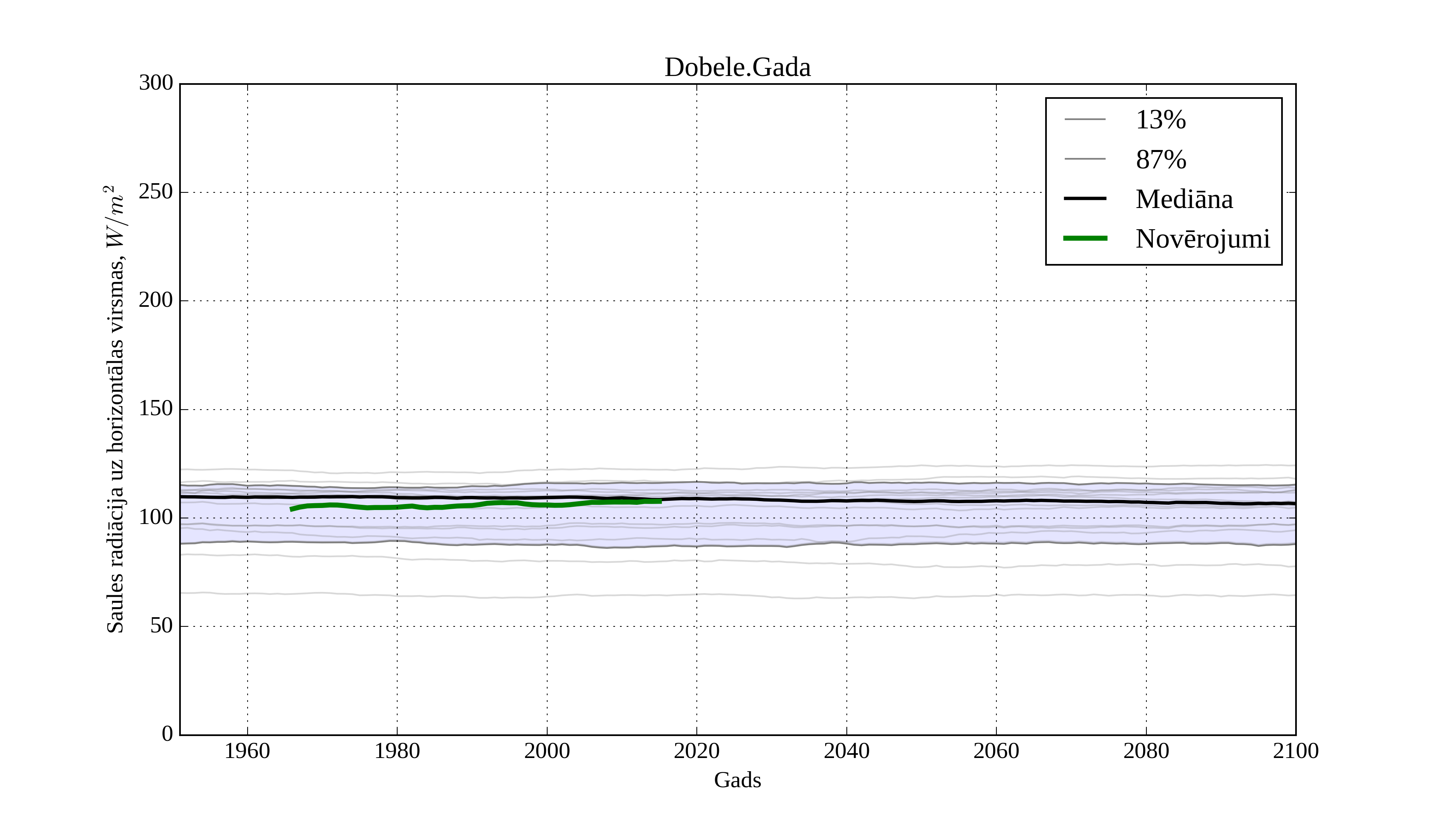 Figure 21. Climatological trend of yearly average solar irradiation on horizontal surface in Dobele with derived RCM irradiation