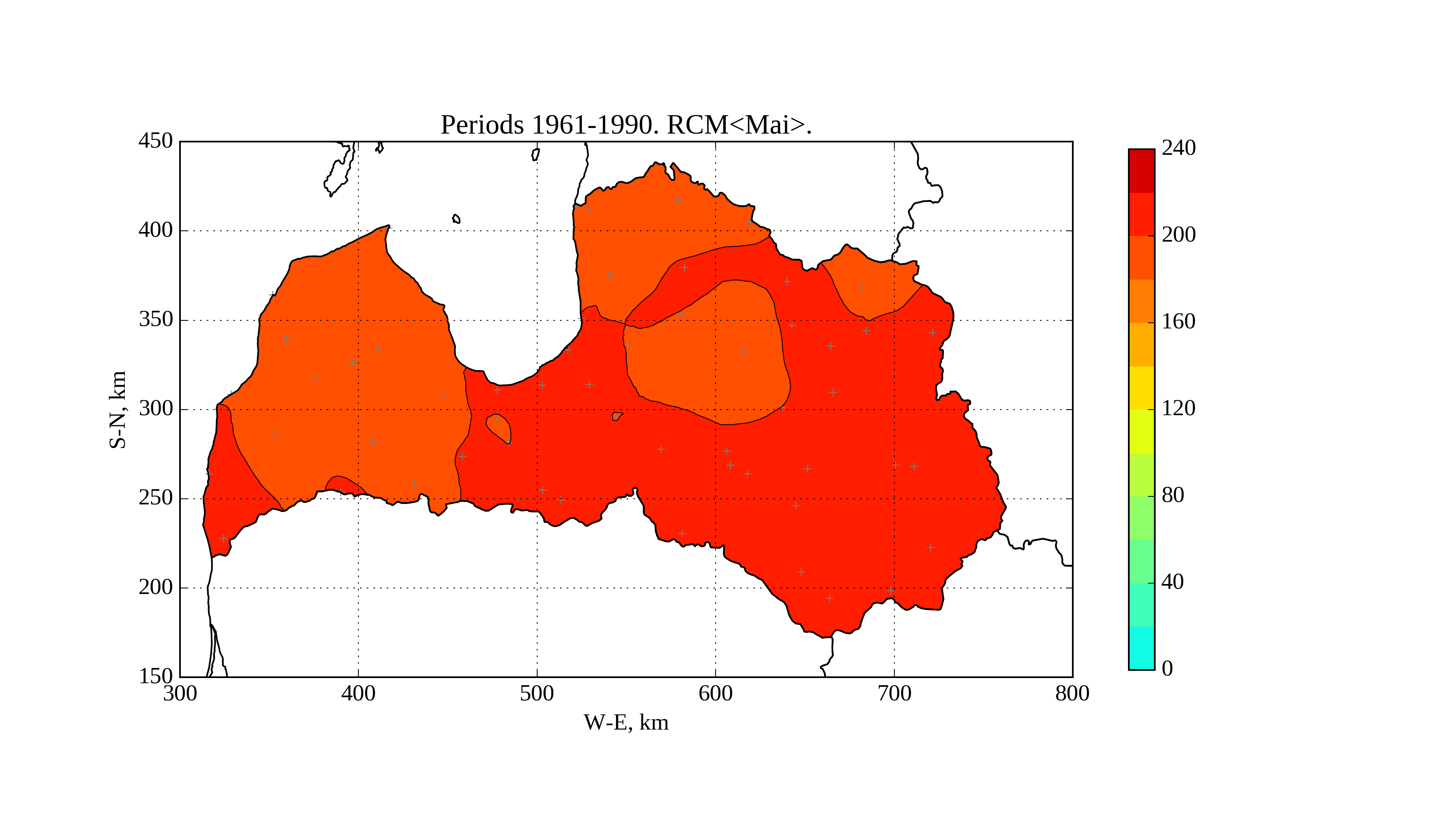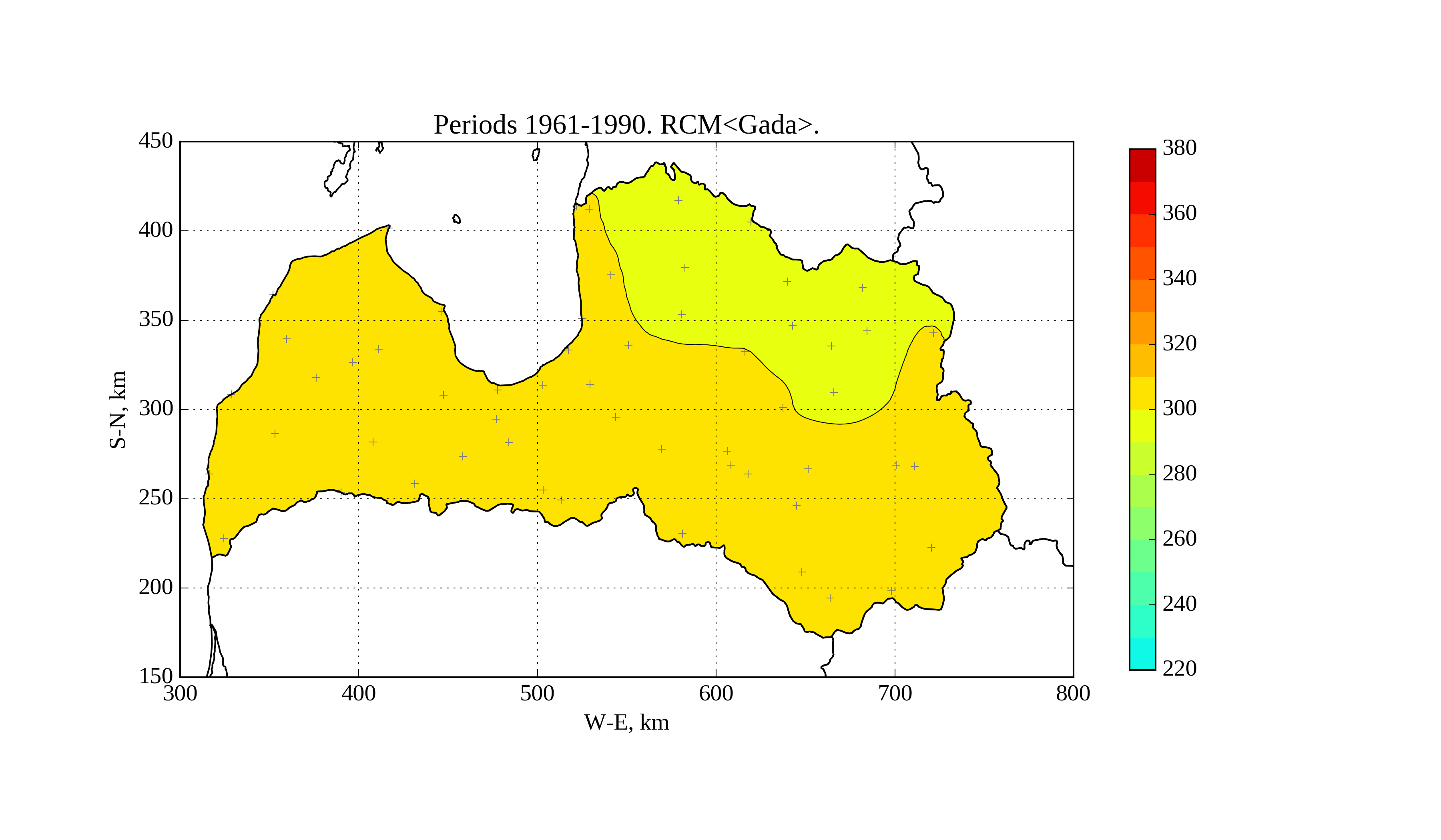 Figure 15. Average solar irradiation [W/m^2] on horizontal surface in May of period 1961-1990 according to RCM