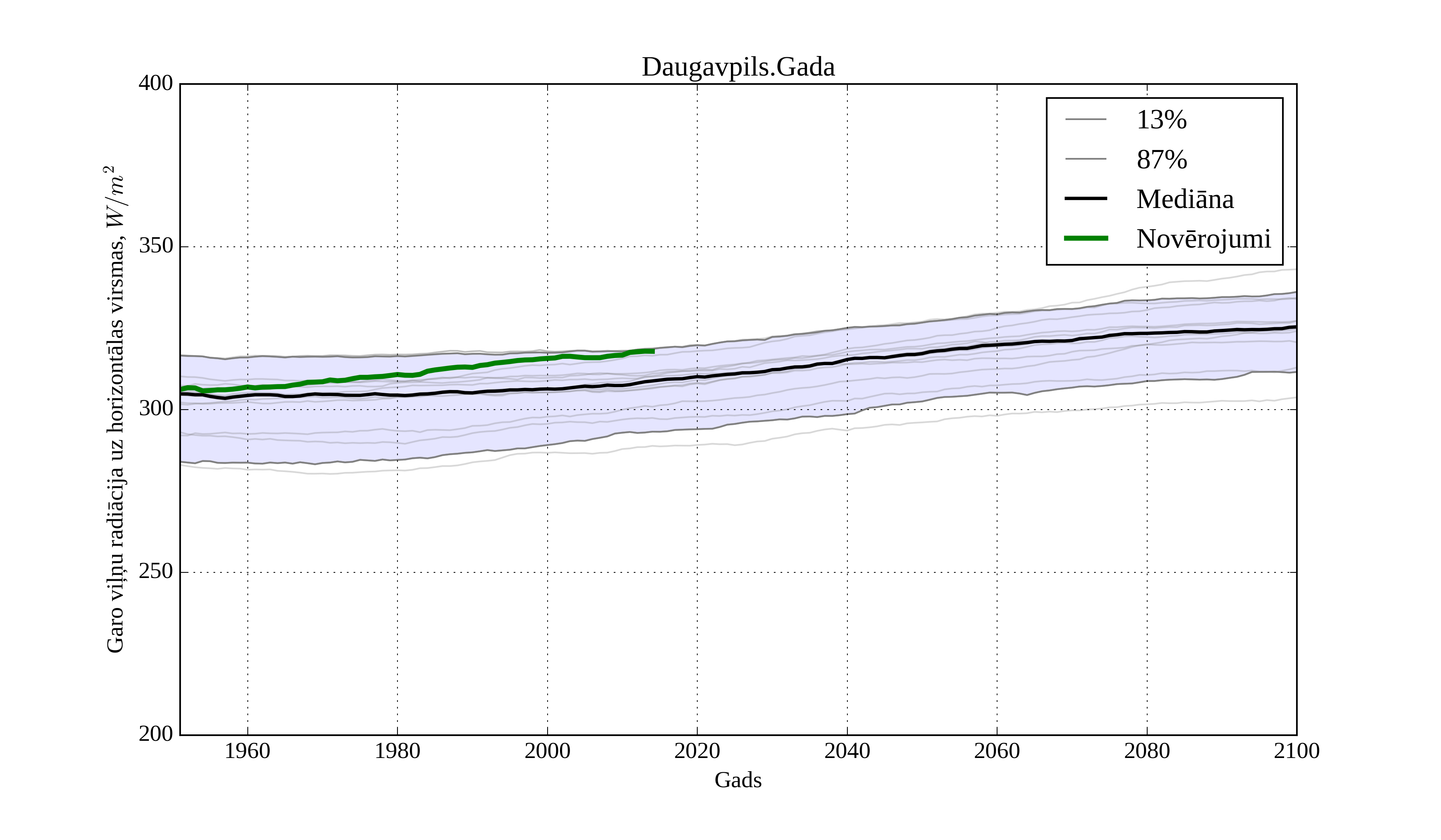Figure 34. Climatological trend of yearly average LW irradiation on horizontal surface in Daugavpils