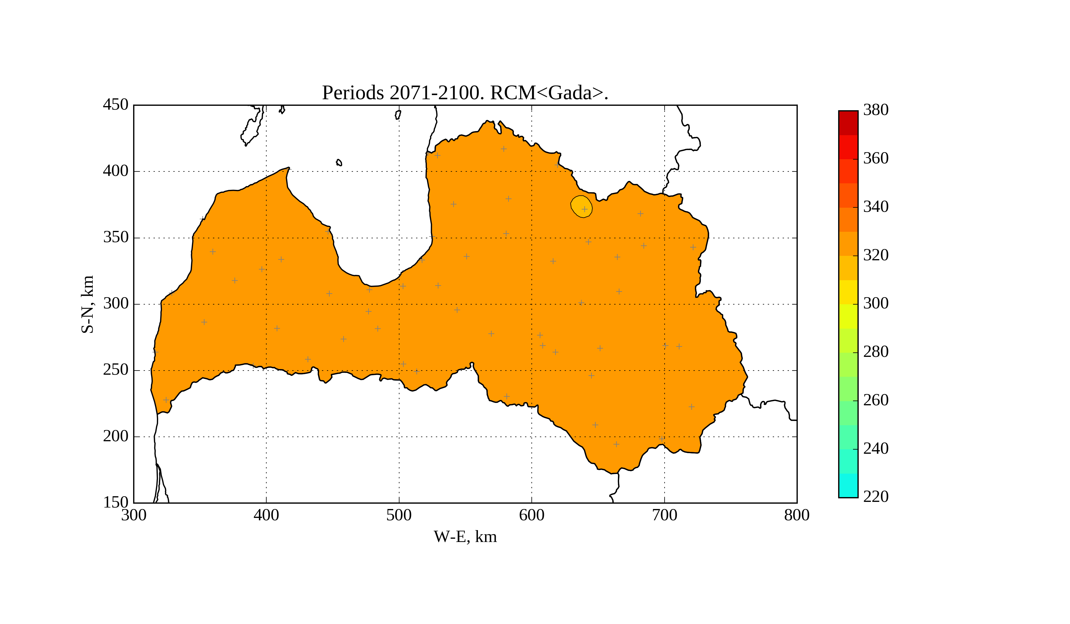 Figure 16. Average solar irradiation [W/m^2] on horizontal surface in May of period 2071-2100 according to RCM